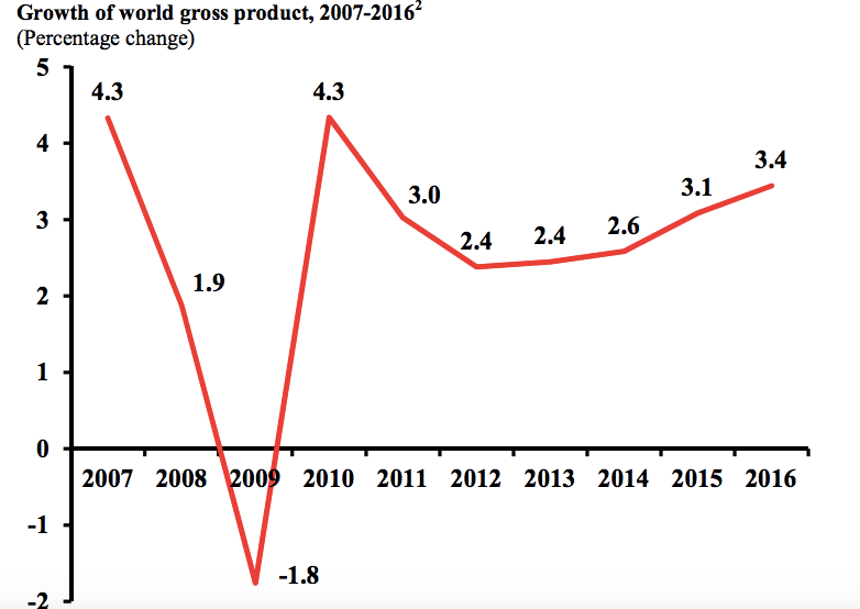 [United Nations, Department of Economic and Social Affairs] The world economy continues to grow at a moderate and uneven pace, encumbered by both the legacies of the global financial crisis and a number of new challenges. The global growth is projected to strengthen in 2015-2016, to a pace of 3.1 per cent and 3.4 per cent, respectively, up from the estimated rate of 2.6 per cent in 2014. This forecast is, however, subject to significant uncertainties and risks.