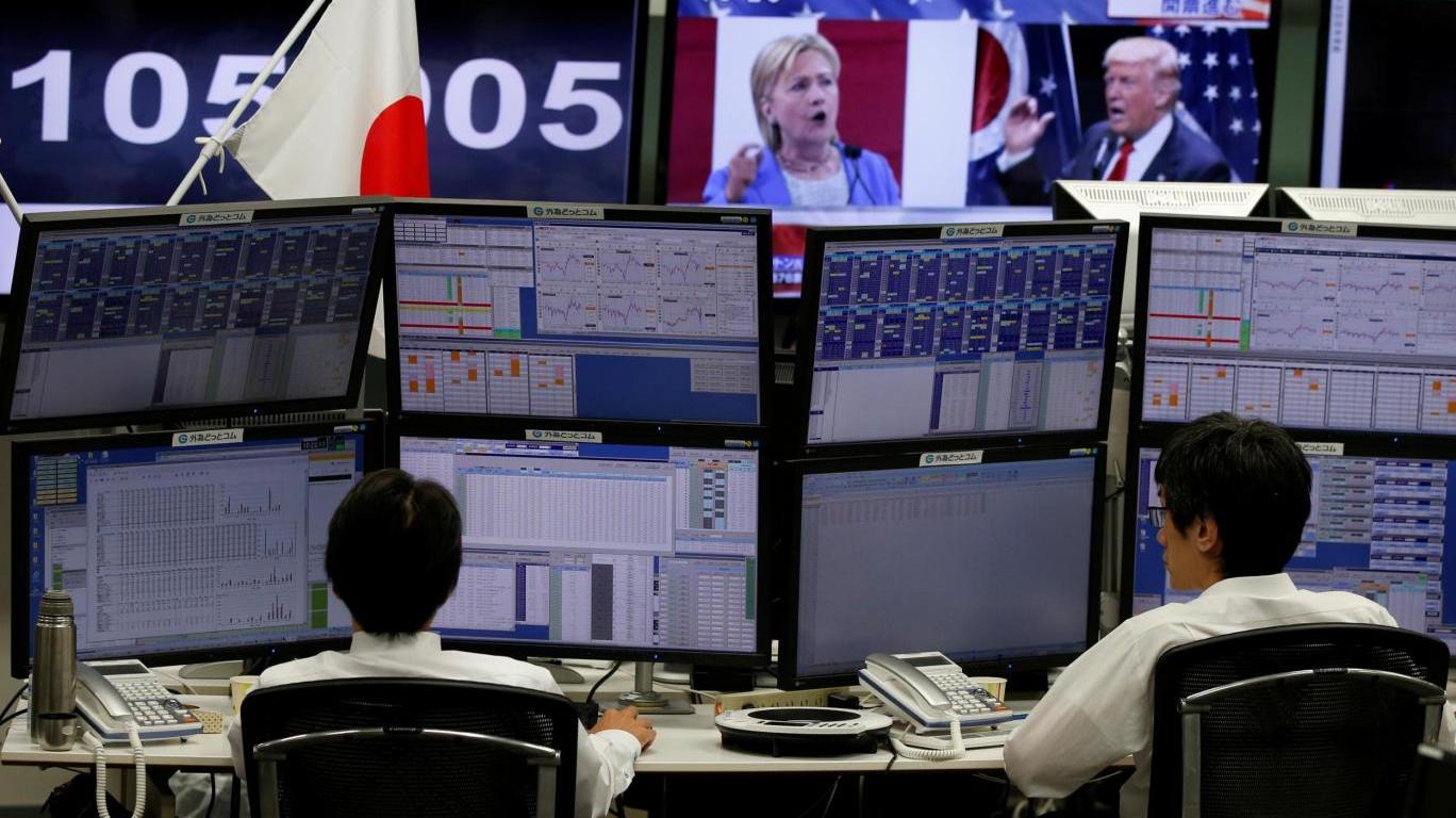 As initial results from the US election showed the Republican candidate was on course to win the presidency, the dollar began to plunge against the yen and the euro.