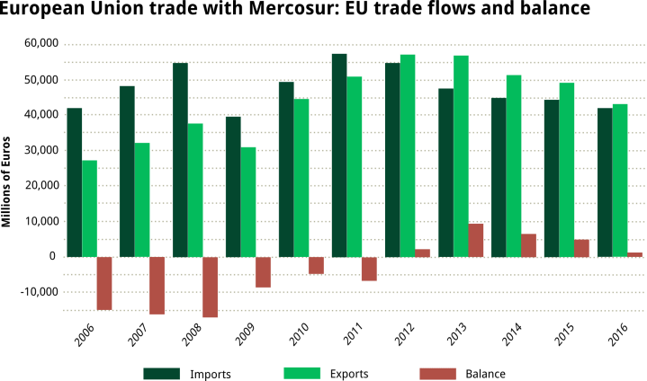 Exports from the EU to Mercosur accounted €43,1 billion in 2016 while exports from Mercosur to the EU were €41,8 billion in the same year. For Mercosur the EU represents 21,8% of its exports, while for the EU, Mercosur represents only 2,7% of its exports. In other words, there is an uneven economic power relation between these two blocks where already the weakest one has a trade deficit in relation to the bigger one.
