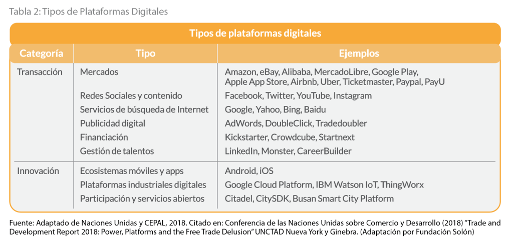 Como puede verse, Apple no es el único actor de la economía de las plataformas digitales, y más abajo desarrollaremos otros ejemplos. En primer lugar, como se ilustrad, hay dos categorías principales de plataformas digitales: Transacción e Innovación. El cuadro 2 muestra un ejemplo de los diferentes tipos de plataformas digitales.