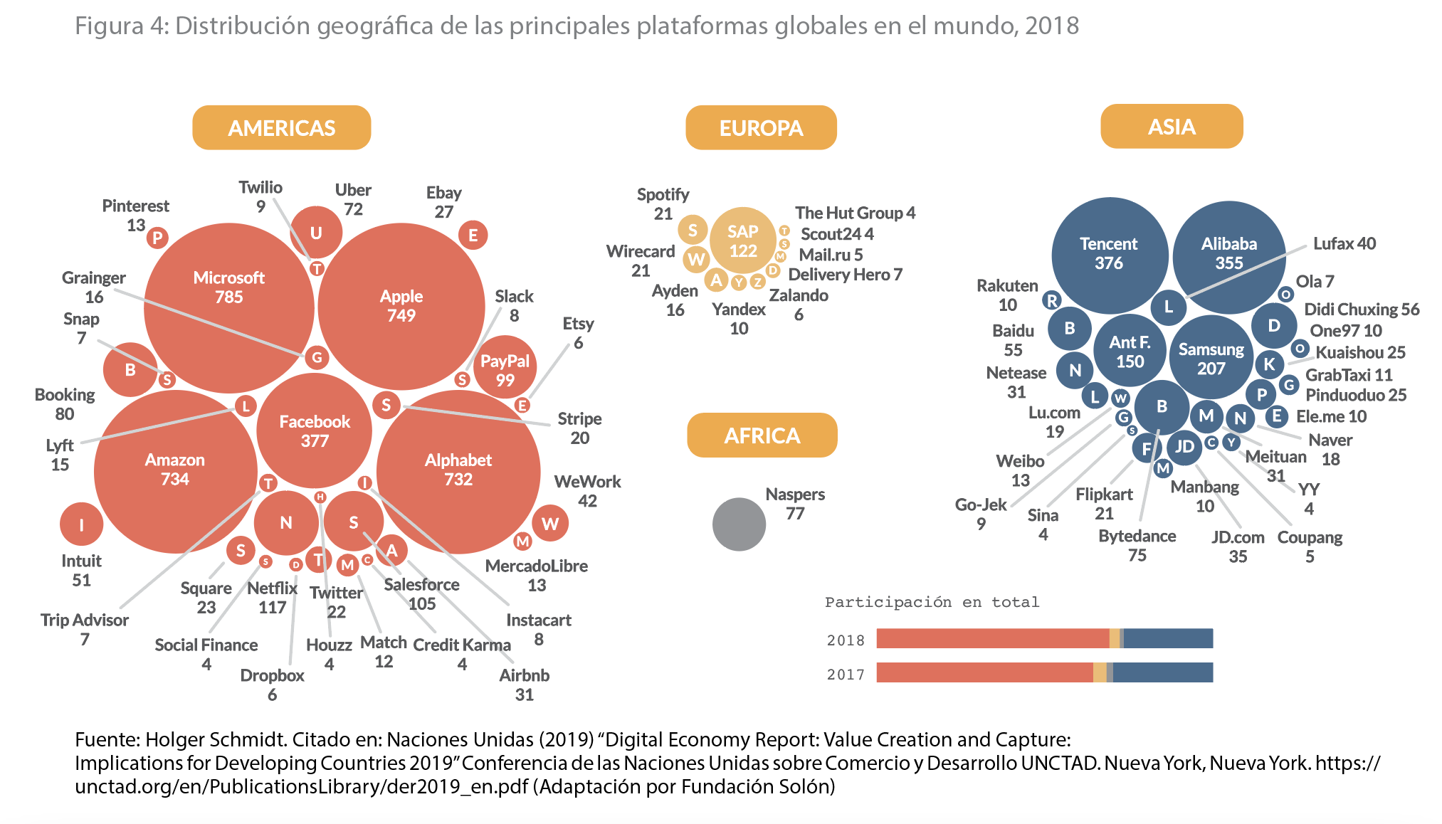 Una sencilla visualización realizada por la UNCTAD del comercio electrónico en el panorama de las plataformas digitales Esto también puede ayudar a tener una instantánea de los actores de la economía de las plataformas digitales e incluso una parte de la economía digital más amplia.