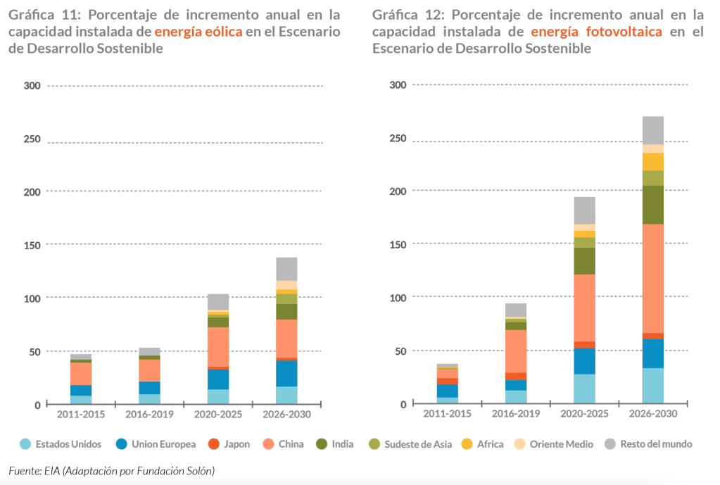 En la región de América Central y del Sur, la AIE prevé que las energías renovables totales aumenten aproximadamente un 30% para el 2030, con respecto a los niveles de 2019, en particular la energía solar fotovoltaica, y que satisfacerán más del 60% de la nueva demanda.
