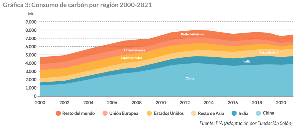 Casi dos tercios del uso del carbón se destinan a la generación de energía. China consume más de la mitad del carbón mundial. La caída del carbón habría sido más grave si no hubiera sido por el repunte económico de la China, que puso un piso a la caída de la demanda mundial.