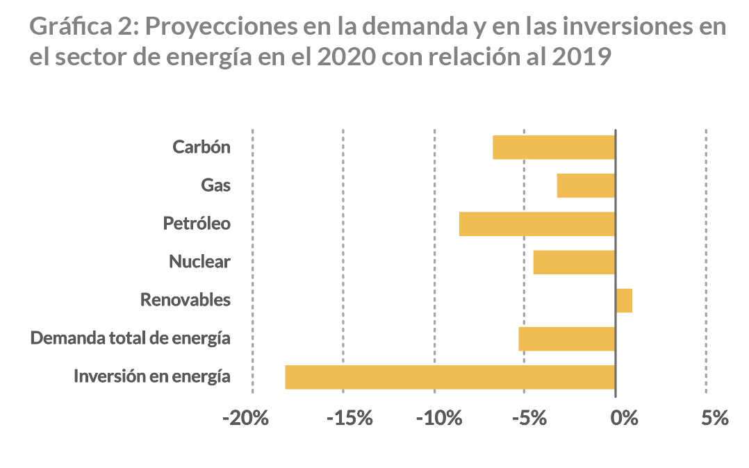 El impacto de la recesión económica mundial no ha sido uniforme en todos los países ni en todo el sector energético. De conjunto los países con cuarentenas más estrictas redujeron su consumo de energía en un 25%, mientras los que tuvieron una cuarentena parcial lo hicieron en un 18%. Las demandas de petróleo y carbón fueron las más afectadas. Le siguieron las de energía nuclear y gas natural. El único sector que siguió creciendo, aunque menos de lo previsto, fue el de las energías renovables según la AIE. Como se puede apreciar en la gráfica 2, de conjunto la demanda de energía se redujo en -5%.