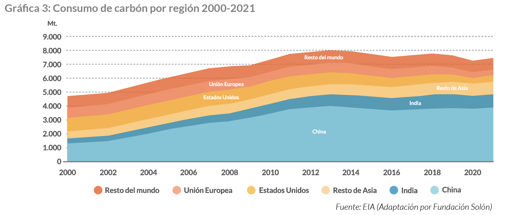 Casi dos tercios del uso del carbón se destinan a la generación de energía. China consume más de la mitad del carbón mundial. La caída del carbón habría sido más grave si no hubiera sido por el repunte económico de la China, que puso un piso a la caída de la demanda mundial.