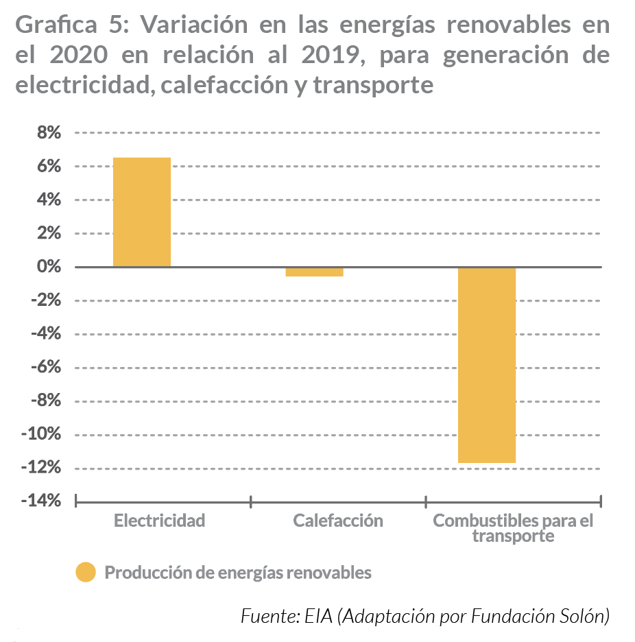 En contraste con los otros combustibles, las energías renovables para la generación eléctrica habrían crecido un 6,6% durante el 2020; mientras las energías renovables para la calefacción y el transporte habrían decrecido, siendo la caída más significativa en este último sector: -11,5%[3].