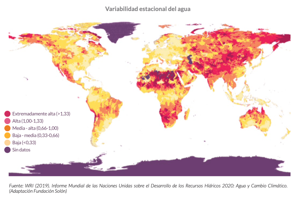 La escasez de agua es un fenómeno estacional más que crónico que será agravado por el cambio climático. La variabilidad estacional mide la medida de la variabilidad de suministros de agua a lo largo del año incluyendo tanto las reservas renovables de superficie como las subterráneas.