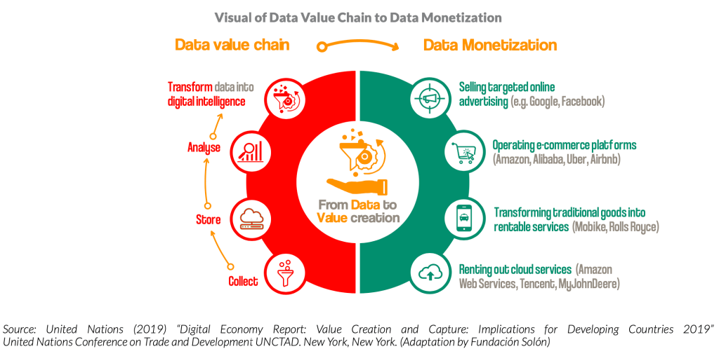 To make a simpler explanation together with a visual, this definition is best understood with the visual below. As mentioned earlier in this text, there is a global data value chain where the equivalent of a raw material in the traditional economy in the digital economy is raw data. Mining, harvesting and transforming this raw data into a monetized form is what has fueled the development of the now massive digital platform economy, which will be delved deeper into in the following chapter. Suffice to say, digital platforms form an economy of its own and plays a critical role in the rise of the digital economy.