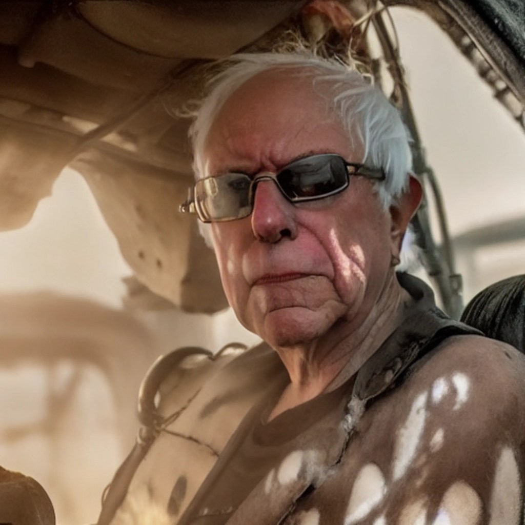 Also part of the first chapter is the relationship between AI and the digital economy. The reason the digital economy and the potential of AI in it is looped in together in this lens is to remind the readers to keep in mind that whatever developments this technology reaches, it has a concrete impact on the digital economy. The potential then of a more powerful, more intelligent and more capable AI can also increase the potential of more effective and faster ways of extracting data from its source which then increases the capacities and capabilities of the platforms that use them. A whole new world of potential for expanding the ways and means of extractivism beyond just data. The second chapter delves into the ongoing controversy of an AI product being used by the internet using public to “generate art” that produces output using original, copyrighted artwork by artists from the indie to the very well-known, most if not all, without consent or recognition. Worse, the algorithms are training on data roughly the size of 6 billion images scraped from the internet complete with artists’ signatures and copyright watermarks by a supposed non-profit called LAION. As it states in its self-description: “The Large-scale Artificial Intelligence Open Network (LAION), (a German) non-profit organization, provides datasets, tools and models to liberate machine learning research. By doing so, we encourage open public education and a more environment-friendly use of resources by reusing existing datasets and models.”[2] Through their non-profit status, LAION was able to generate LAION-5B: “a dataset of 5.85 billion CLIP-filtered image-text pairs, 14x bigger than LAION-400M, previously the biggest openly accessible image-text dataset in the world.”[3] The AI “art generator” called Stable Diffusion has trained on and accesses this massive data set to generate images from text. How it works: one goes to Stable Diffusion, type in key words of what image or “artwork” one would like to generate, such as: “Bernie Sanders in Mad Max Fury Road” see results below.