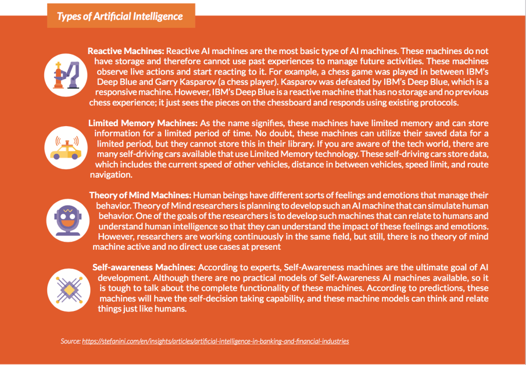 From these everyday examples, time now, for a small bit of a technical discussion just to understand the mechanics, or as a car mechanic would say, taking a look under the hood to see the engine and all that makes it work. First, there are four types of AI: