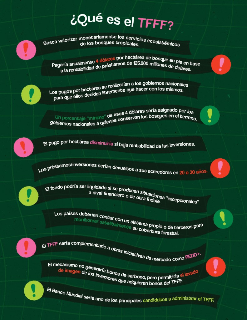 El TFFF sería un mecanismo que no generaría créditos de carbono o de biodiversidad, y tampoco permitiría “offsetting” o compensaciones como los bonos de carbono que son permisos para seguir contaminando en un determinado lugar, gracias a la compra de certificados de reducción de emisiones en otro lugar. El TFFF sería diferente pero complementario a los mercados de carbono de REDD+. Mientras REDD+ contabilizaría las toneladas de carbono que supuestamente se reducen, el TFFF buscaría recompensar por hectárea de bosque en pie.