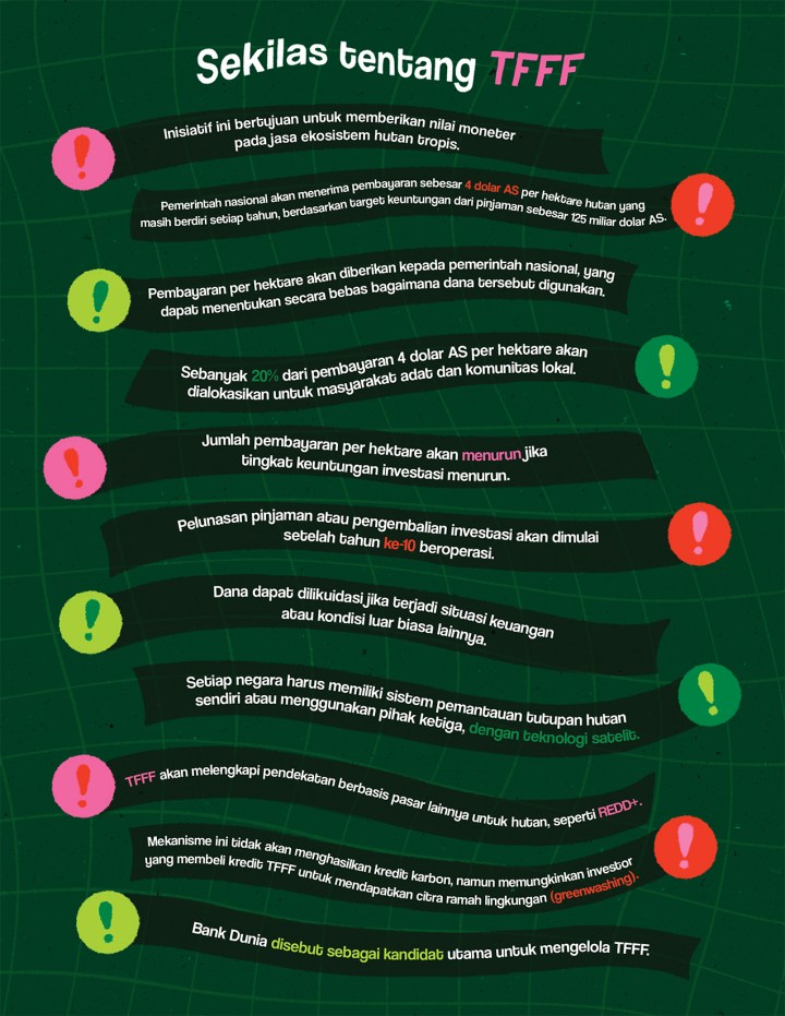 Kita harus mengakui bahwa hutan tropis adalah pemegang hak, bukan sekadar penyedia jasa ekosistem yang dapat dikomodifikasi melalui instrumen perbankan. Untuk menyelamatkan hutan tropis, penting untuk menyadari bahwa masalah utamanya bukan kegagalan pasar, melainkan kurangnya penghormatan dan perlindungan terhadap sistem kehidupan yang memiliki hak untuk hidup, mempertahankan siklus hidupnya, kemampuan regenerasinya, untuk tidak dihancurkan atau dicemari, menjaga integritas dan keberagamannya, serta menuntut pemulihan dan restorasi yang tepat waktu dari mereka yang telah dan terus berkontribusi terhadap kehancurannya. Pohon tidak bisa menjadi pemegang saham, sebagaimana klaim absurd para kolumnis yang mempromosikan TFFF. Hutan adalah komunitas yang kompleks dan dinamis, tempat pohon, tumbuhan, hewan, mikroorganisme, dan komunitas manusia saling berinteraksi, dan masyarakat adat memiliki praktik leluhur hidup berdampingan dengan hutan. Sistem kehidupan ini tidak boleh diperlakukan sebagai objek atau komoditas, tetapi harus memiliki hak untuk menggugat dan menuntut ganti rugi dari korporasi dan pemerintah yang bertanggung jawab atas kehancurannya.