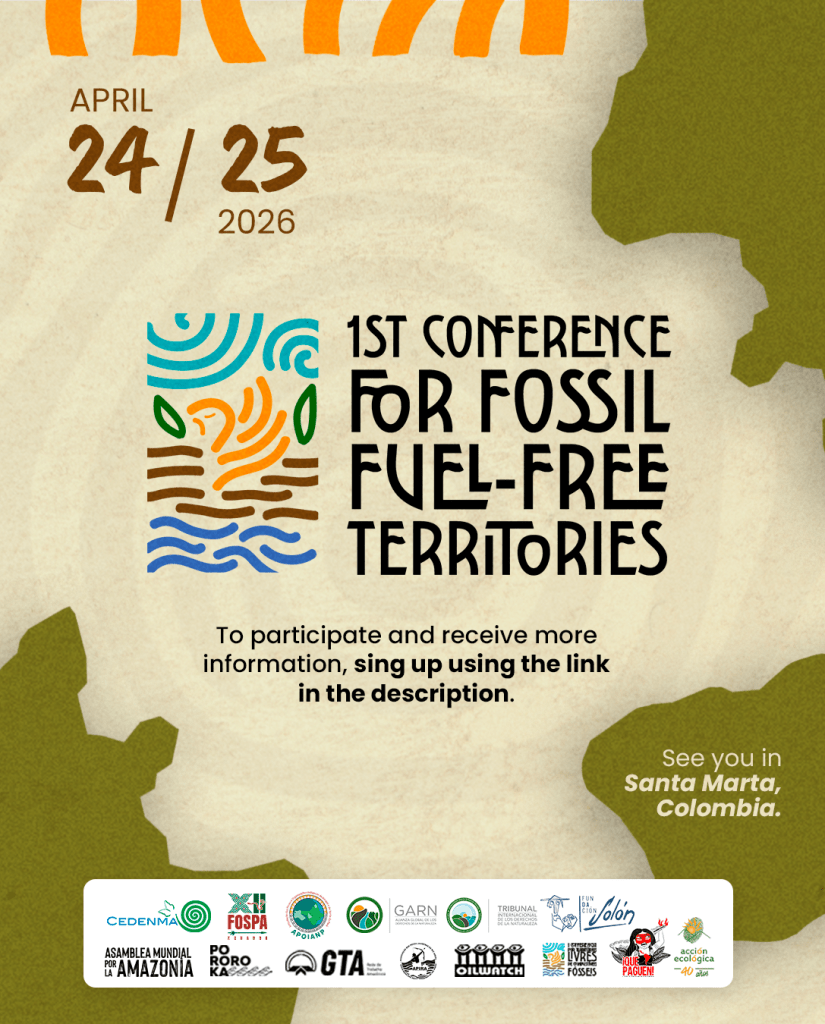 Las organizaciones abajo firmantes convocamos a la Conferencia por Territorios Libres de Combustibles Fósiles para fortalecer, articular y ampliar las luchas territoriales contra los extractivismos, y construir un plan de acción que recoja y potencie las estrategias para impedir, frenar, cerrar, reparar y salir de los combustibles fósiles.